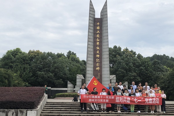 小队成员与同时前来的党员一同参观纪念园。进入园中,绕过红旗飘飘柱阵,在北上抗日出征门前,我们了解到:1938年3月18日,国共和谈,山门集中北上抗日。